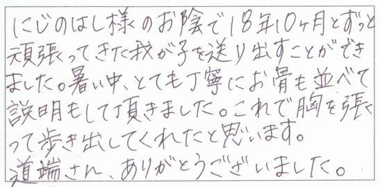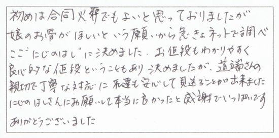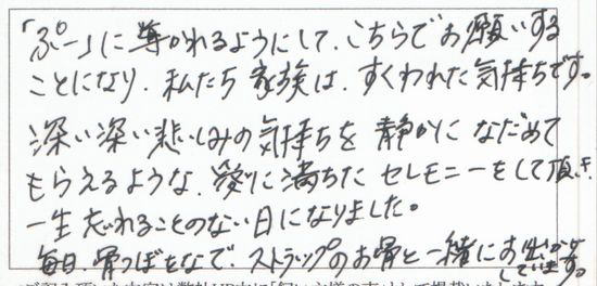 にじのはしをご利用いただいた飼い主様からのお声を、一部ご紹介いたします。私たちは、皆様の大切な家族とのお別れに寄り添う存在でありたいと願い、それぞれの思いを込めたセレモニーをお手伝いしてまいりました。たくさんの温かなご感想や感謝のお言葉をいただいており、スタッフ一同大変励まされております。過去に寄せられた飼い主様の声は、下記リンクより一覧でご覧いただけますので、ぜひご参照ください。
